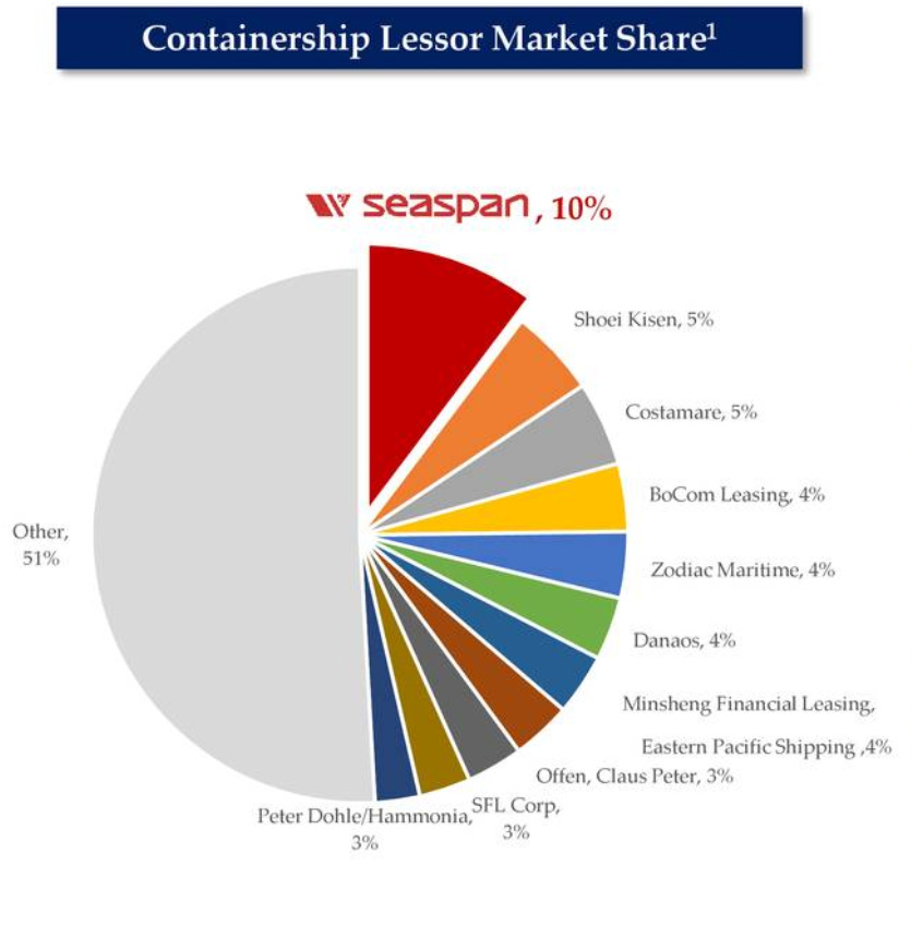 Atlas makes money through two divisions, Seaspan and APR Energy, its most recent acquisition. Seaspan accounts for ~86% of adjusted EBITDA. Seaspan has a fleet of 160 vessels, and offices in Hong Kong, Canada, and India making it the largest independent owner and operator of containerships in the world with around 10% of the global market share.
